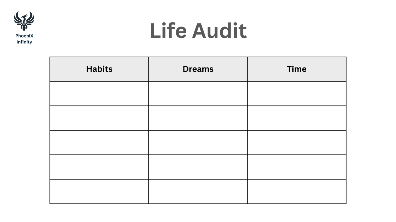 Once you’ve taken the snapshot, the next step is to zoom in. That’s where life audits come in. Short, structured reflections that reveal what’s really driving your current reality. In Phoenix, we use three simple audits: Habits, Dreams, and Time.